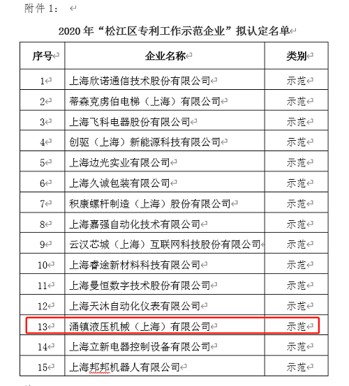 2020年涌鎮液壓成功入選“松江區專(zhuān)利示范企業(yè)”行列,并獲得立項。